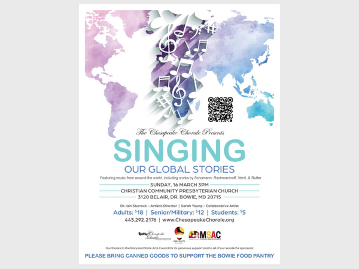 “Singing Our Global Stories” The Chesapeake Chorale, under the direction of Dr. Iain Sturrock, will perform a program of international music. Program will include pieces by Schumann, Rachmaninoff, Verdi, and Rutter. Concert is on Sunday, March 16th, 3PM, at the Christian Community Presbyterian Church, 3120 Belair Dr. Bowie MD 20715. Tickets: $18 (adult); $12 (senior/military); $5 (student). For online ticket sales visit www.chesapeakechorale.org, or call 443-292-2176.