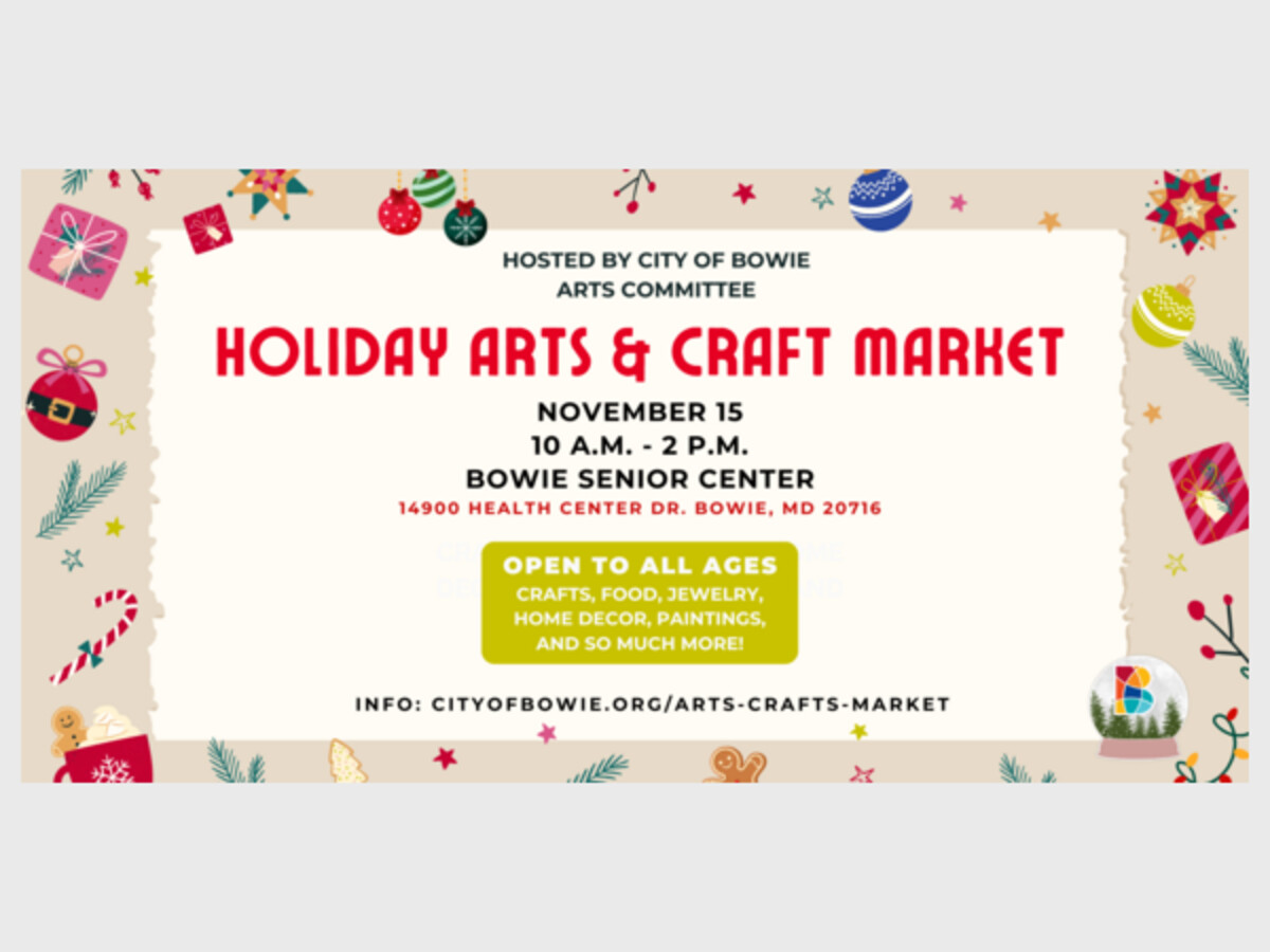 The City of Bowie invites you to the Holiday Arts + Crafts Market on Saturday, November 15, 2025, from 10 a.m.to 2 p.m. at the Bowie Senior Center. Admission is free and open to all ages.