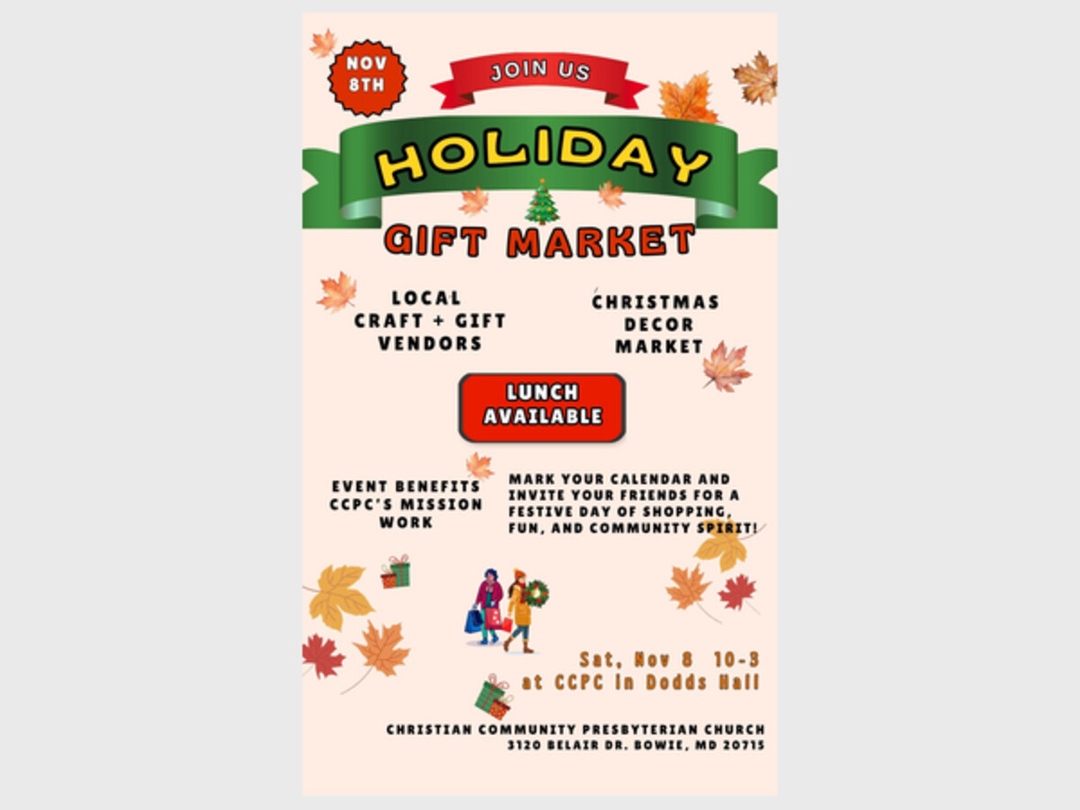 CCPC is hosting its 2nd Annual Holiday Gift Market with local craft vendors, a bake sale and a Christmas Decor Flea Market to brighten your holiday spirit. All proceeds will benefit the Mission Projects of the church such as Warm Nights, Christmas Angels, and the Bowie Interfaith Food Pantry.
